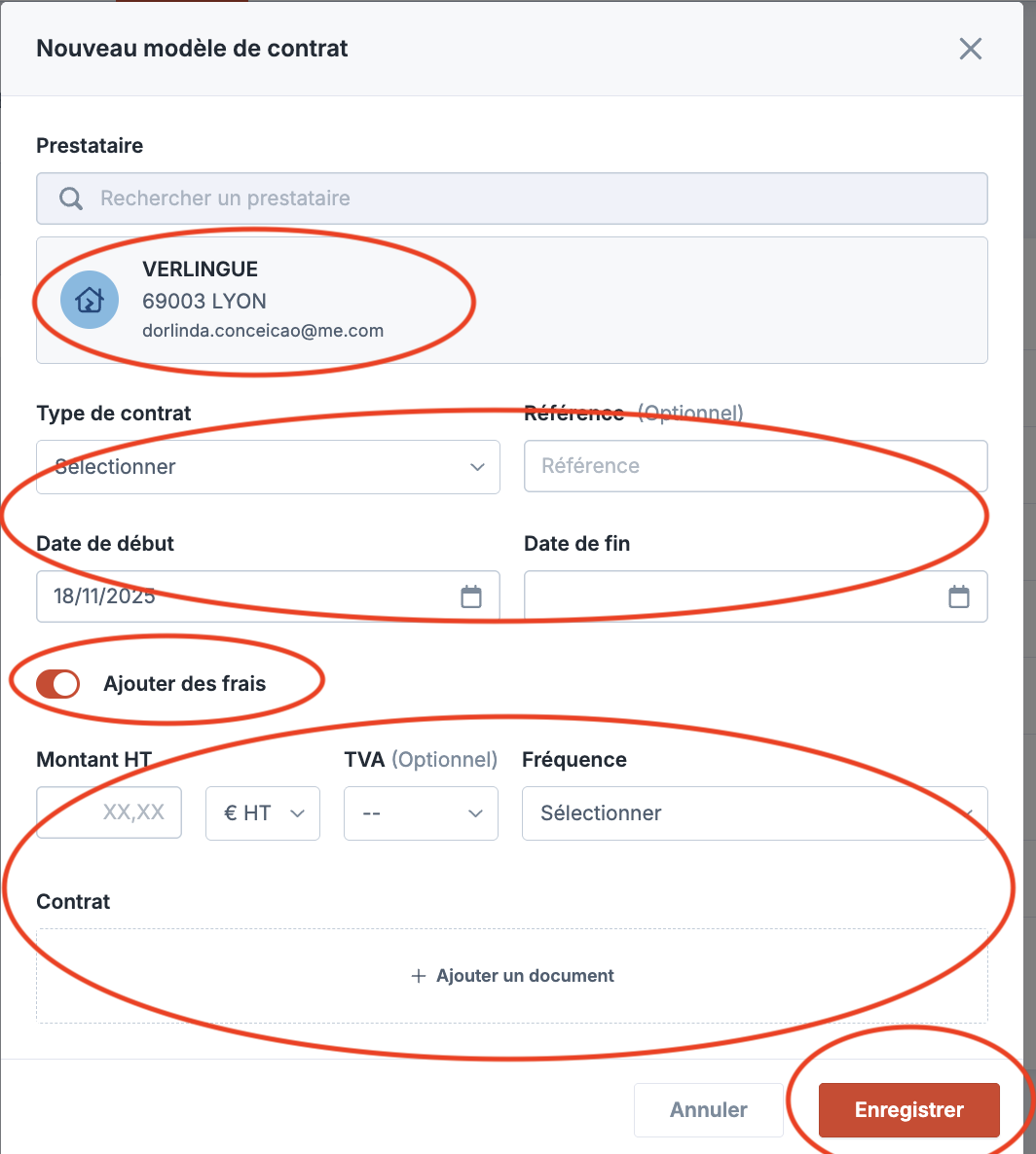 Renseignez le formulaire "Nouveau modèle de contrat" en le rattachant à un prestataire