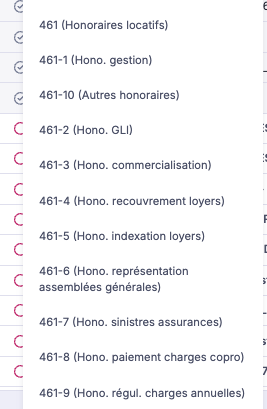 Comptes 461 (honoraires locatifs) / 461-1 (Hono. gestion) / 461-10 (Autres honoraires) / 461-2 (Hono GLI) / etc....