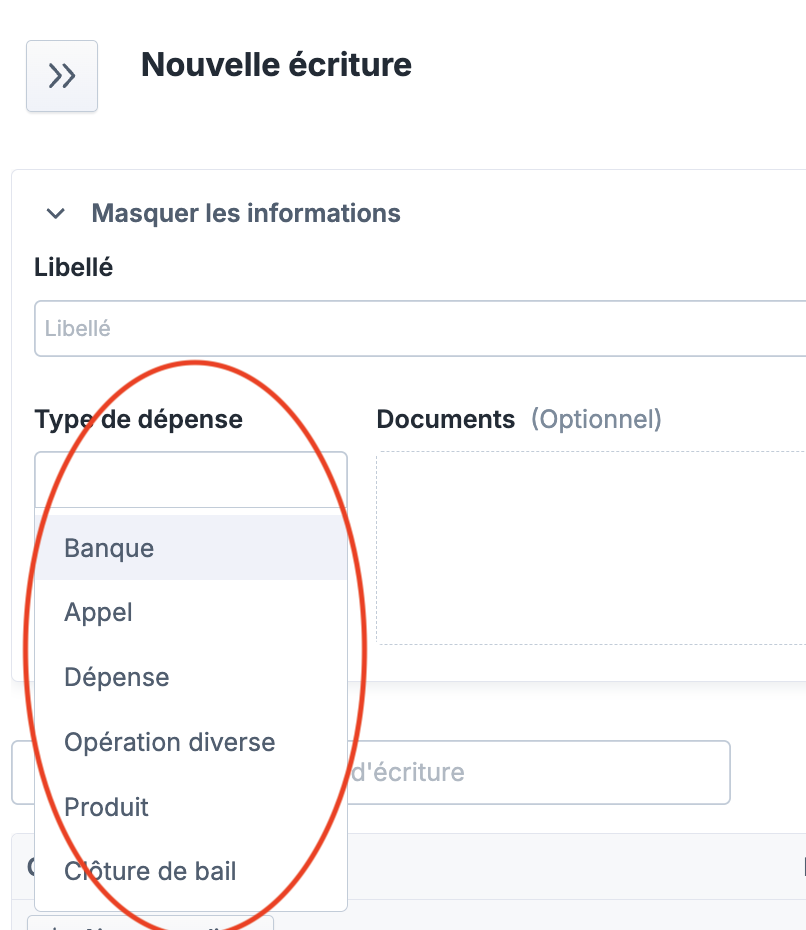Sélectionner le "Type de dépense" (Banque/Appel/Dépense/Opération diverse/Produit).
