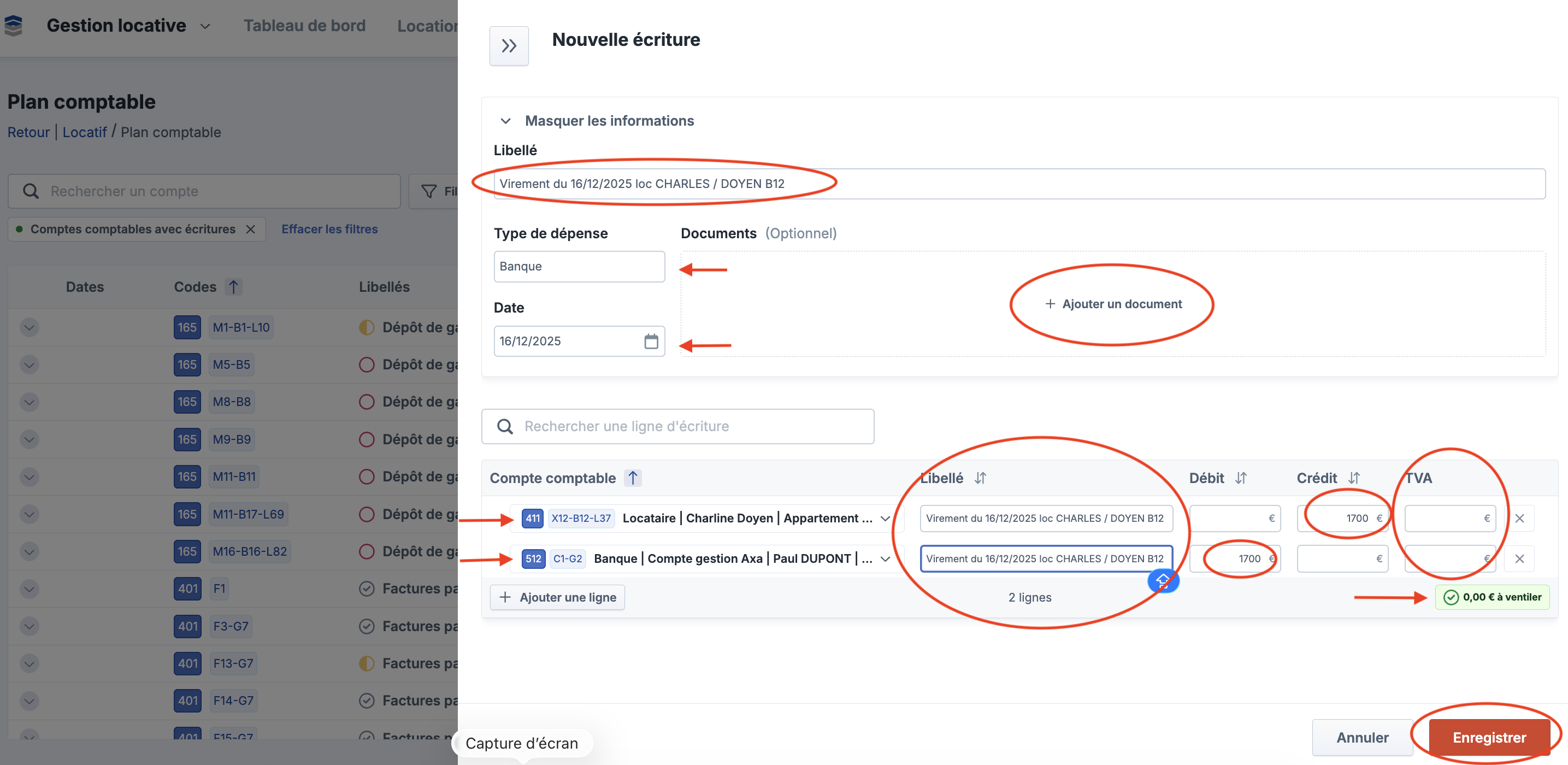 Exemple d'une OD correspondant à une écriture de banque (virement d'un locataire) hors fichier CFONB :