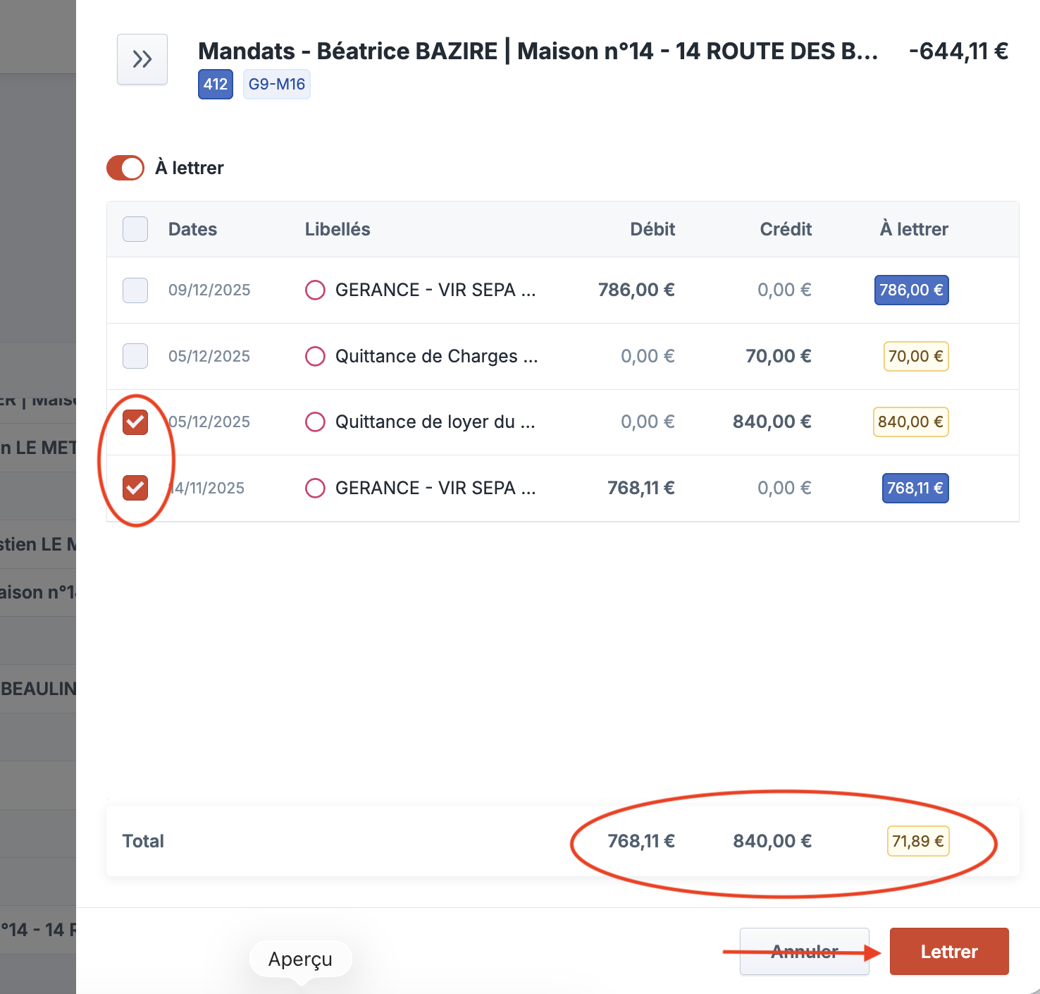 Cliquez sur "Lettrer le compte" fenêtre à droite qui s'ouvre.
