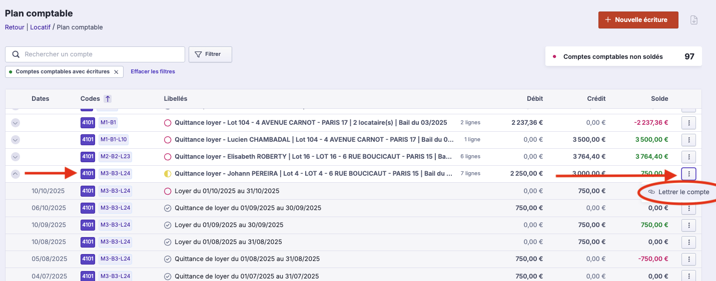 Cliquez sur les "3 points" à droite du "Compte à lettrer".