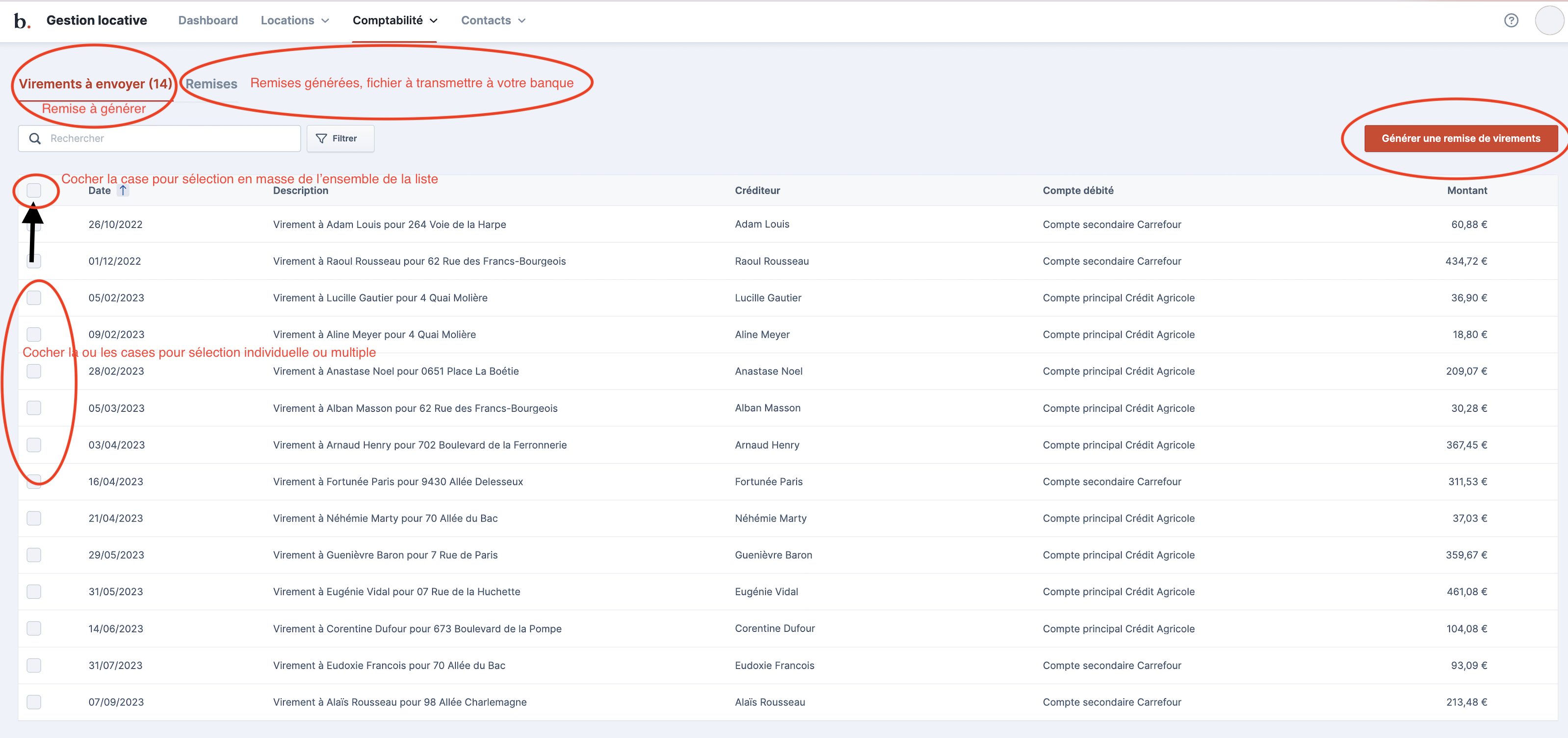 💡 Pour générer en masse les remises de virement, cocher la case dans la première ligne du tableau pour tous sélectionner en masse.
