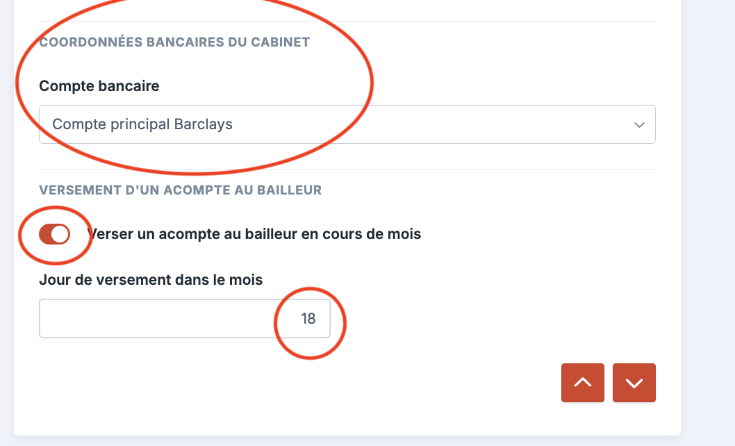 Paramétrer l'"IBAN du bailleur", le "compte de votre cabinet" (si vous avez plusieurs) et le "jour du mois" choisi pour le versement de cet acompte .
