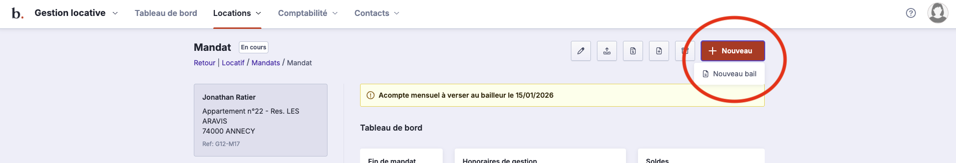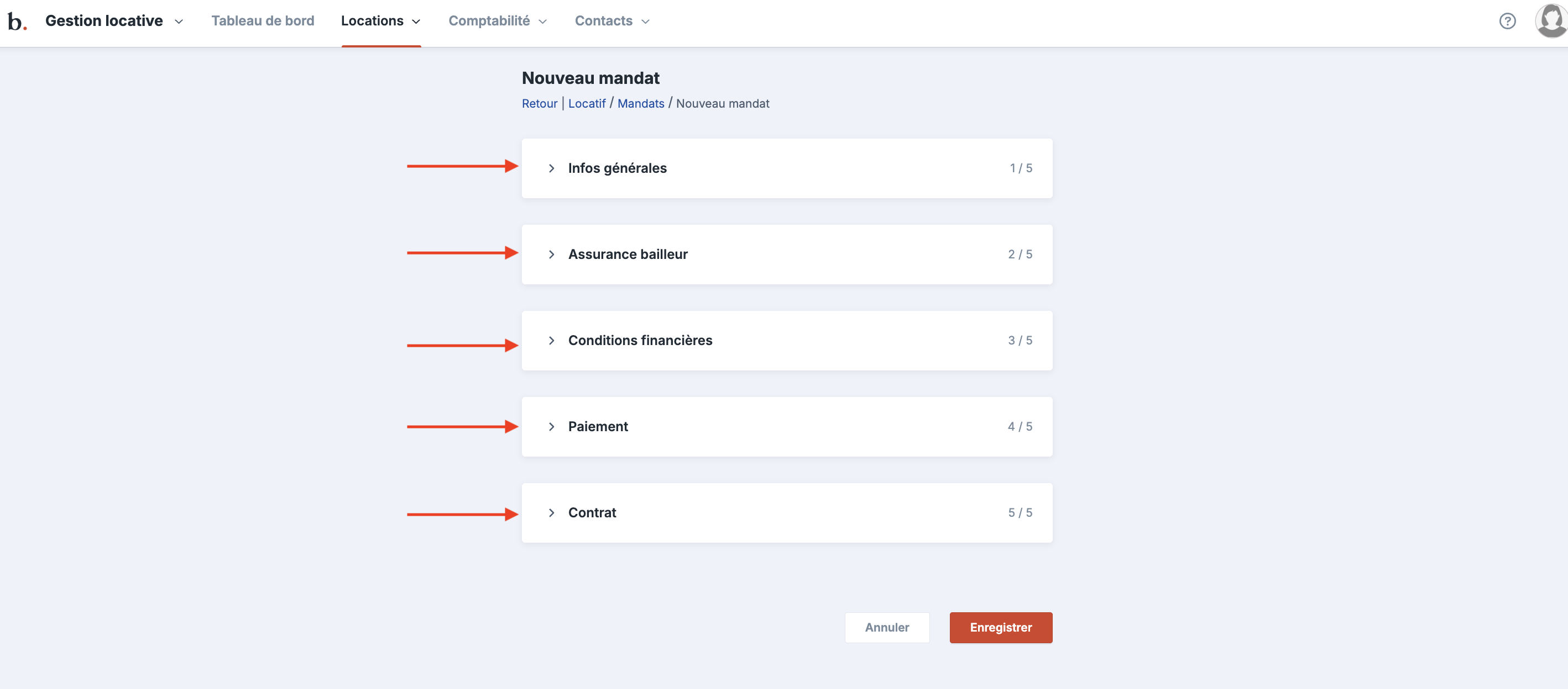 💡 Cette étape consiste à renseigner les informations relatives au mandat de gestion. Nous vous conseillons de créer, en amont, votre immeuble/lot/contact/prestataires rattachés à votre "mandat" et votre "bail" s'ils ne sont pas déjà dans votre base de données.