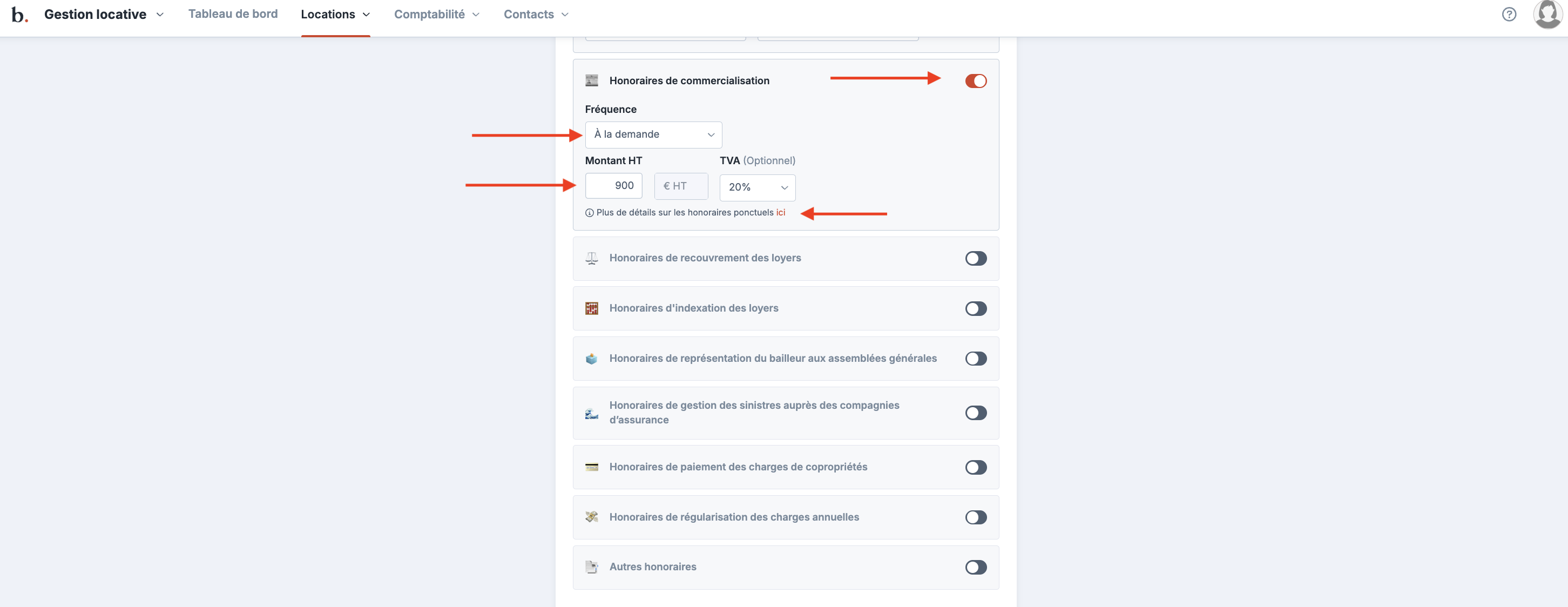💡La partie "Honoraires de commercialisation" est à activer pour la facturation. Vous devez "activer l'option" pour faire apparaître les champs à renseigner. La fréquence "A la demande" est l'option à sélectionner pour tous les honoraires qui se facturent ponctuellement (ex : Honoraires de commercialisation et location / sinistre / contentieux / travaux / etc....)