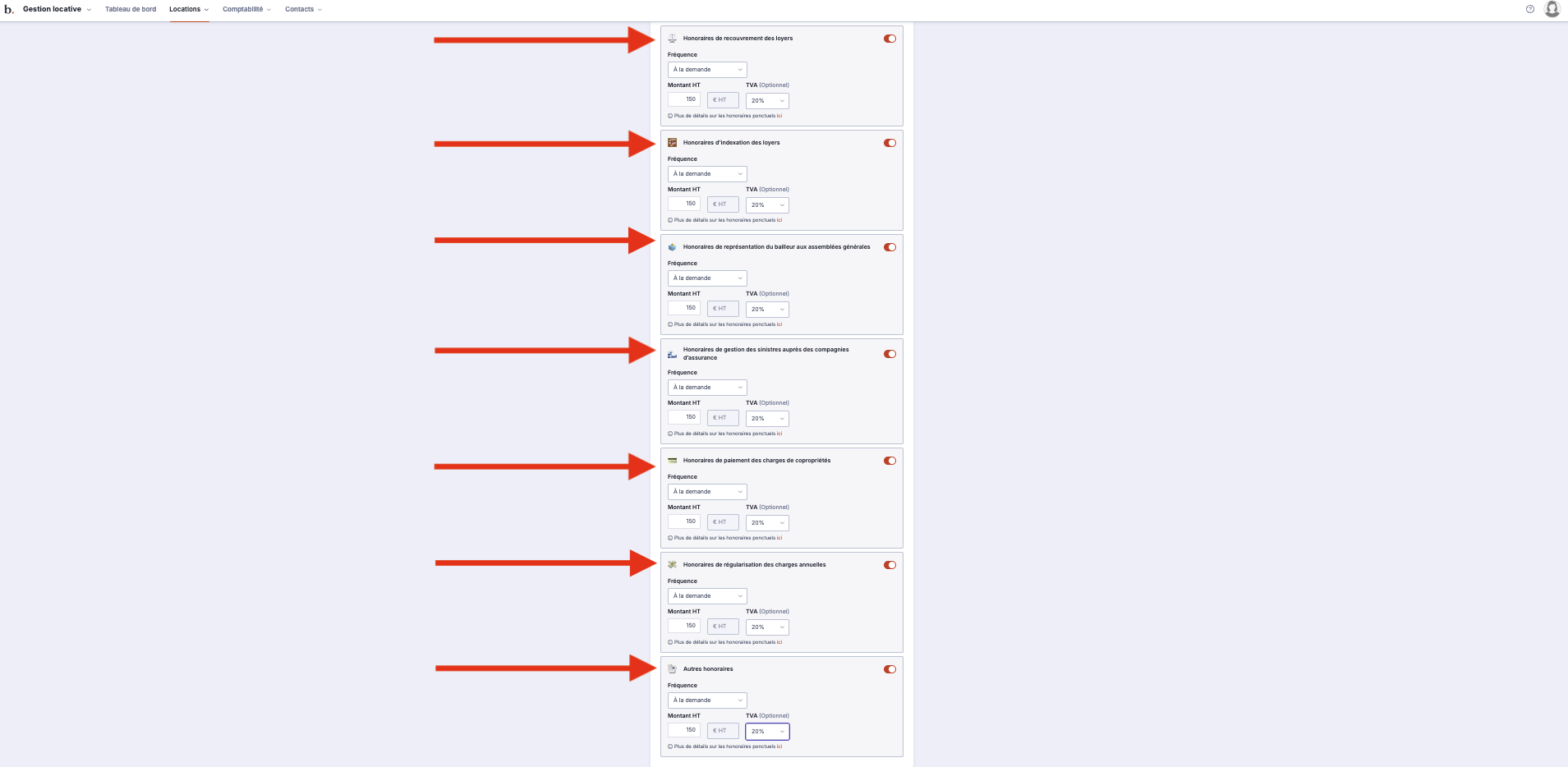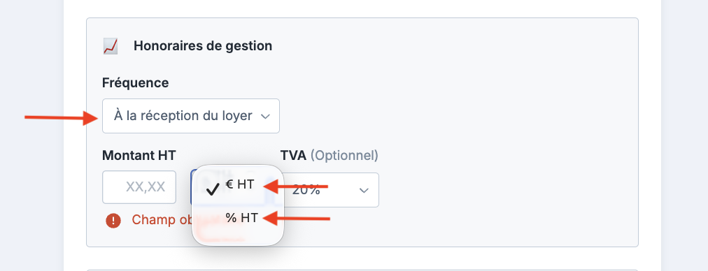 💡La partie "HONORAIRES DE GESTION" permet une facturation en % ou en forfait. Choisir la "FRÉQUENCE" puis cliquez sur le menu déroulant à côté de "Montant HT".