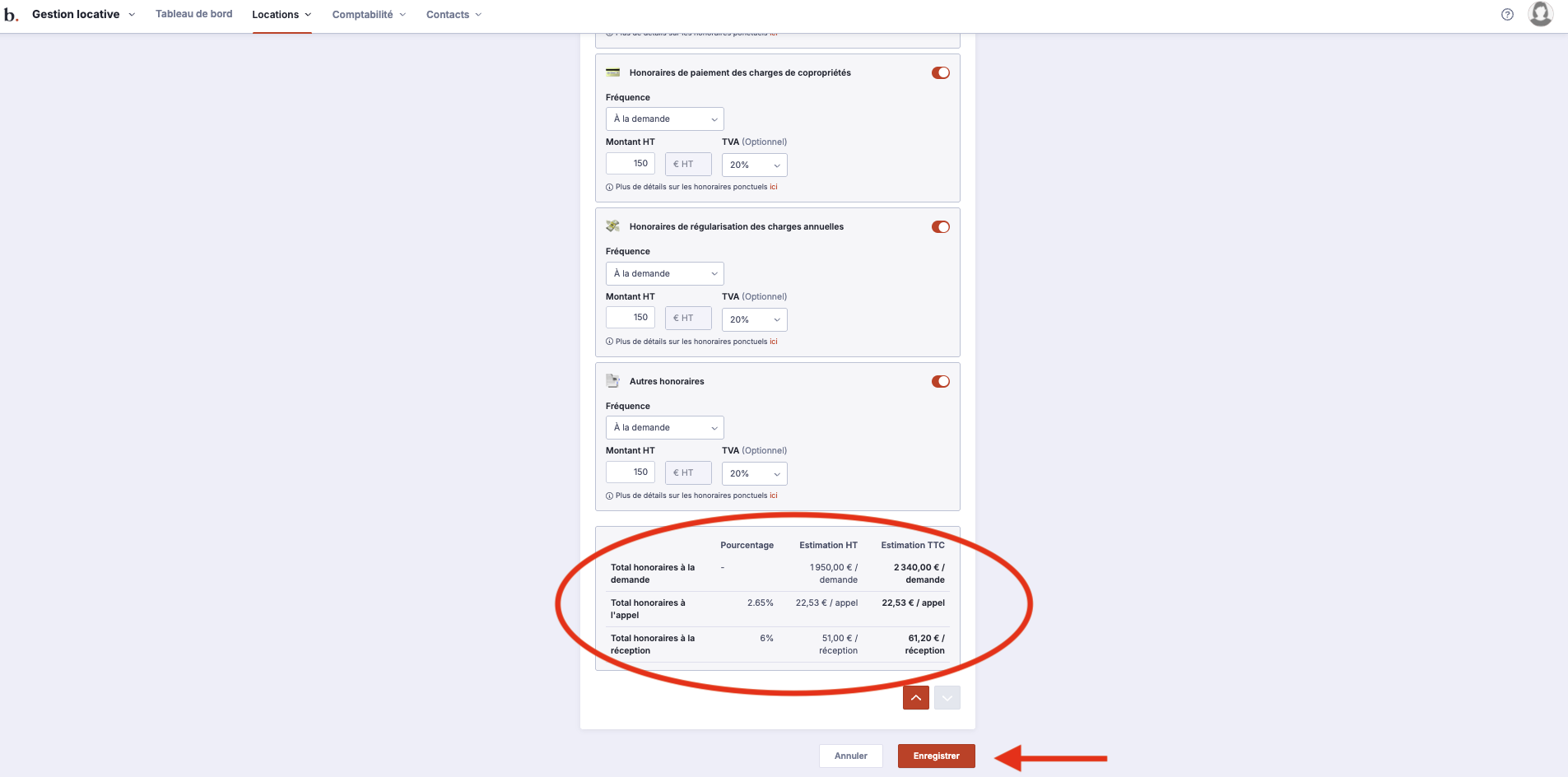 Cliquez sur “Enregistrer” pour finaliser la création de votre mandat dans votre base de donnée. Si vous avez renseigné les montants du loyer et charges souhaités, vous pourrez visualiser un récapitulatif du calcul des honoraires renseignés en amont (à titre indicatif).