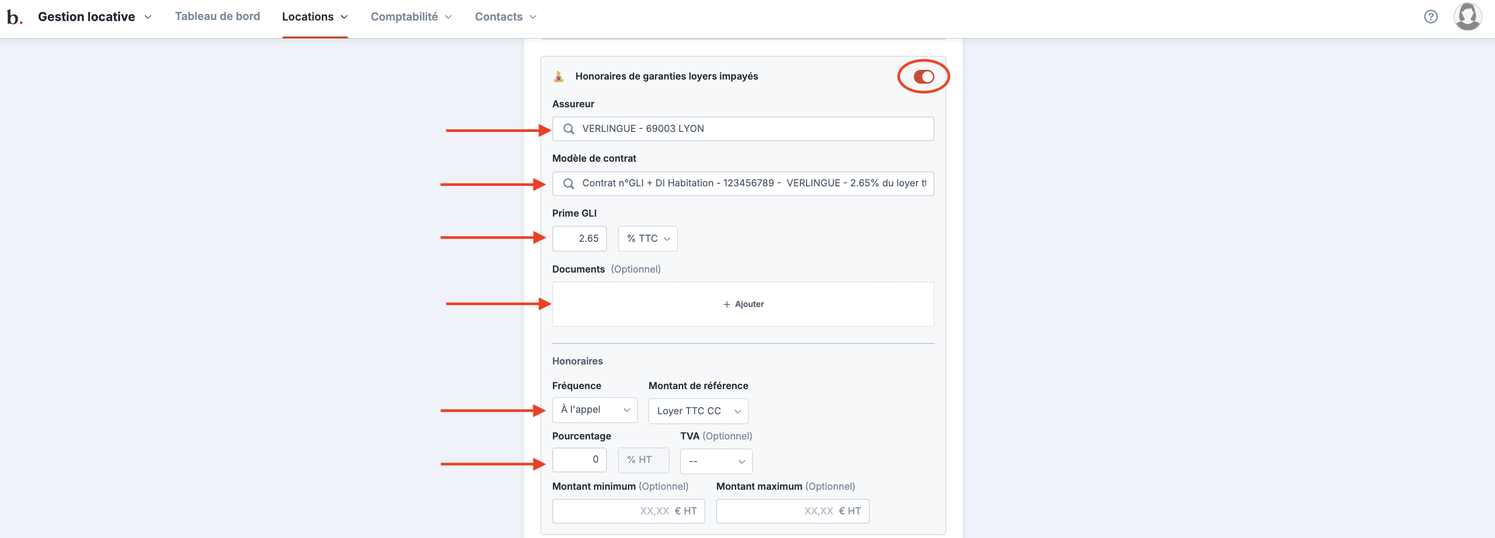 💡La partie "Honoraires de garanties loyers impayés" est à renseigner si le mandat de gestion est soumis à GLI. Vous devez "activer l'option" pour faire apparaître les champs à renseigner.
