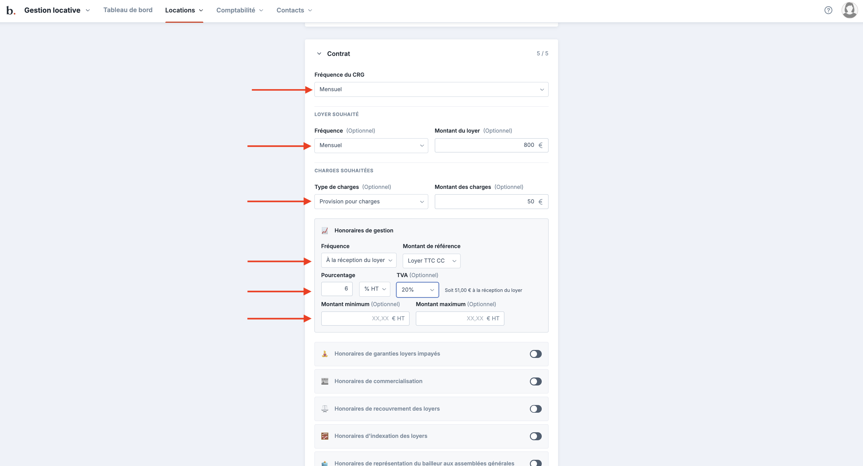Renseignez l'onglet “Contrat et Honoraires de gestion ” .