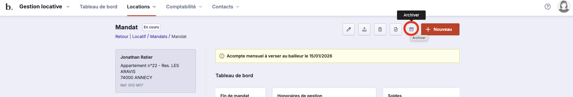 💡Archiver un mandat (ne pas confondre avec clôturer un mandat). S'utilise si le mandat n'a pas de bail rattaché et pas d'écritures comptables.