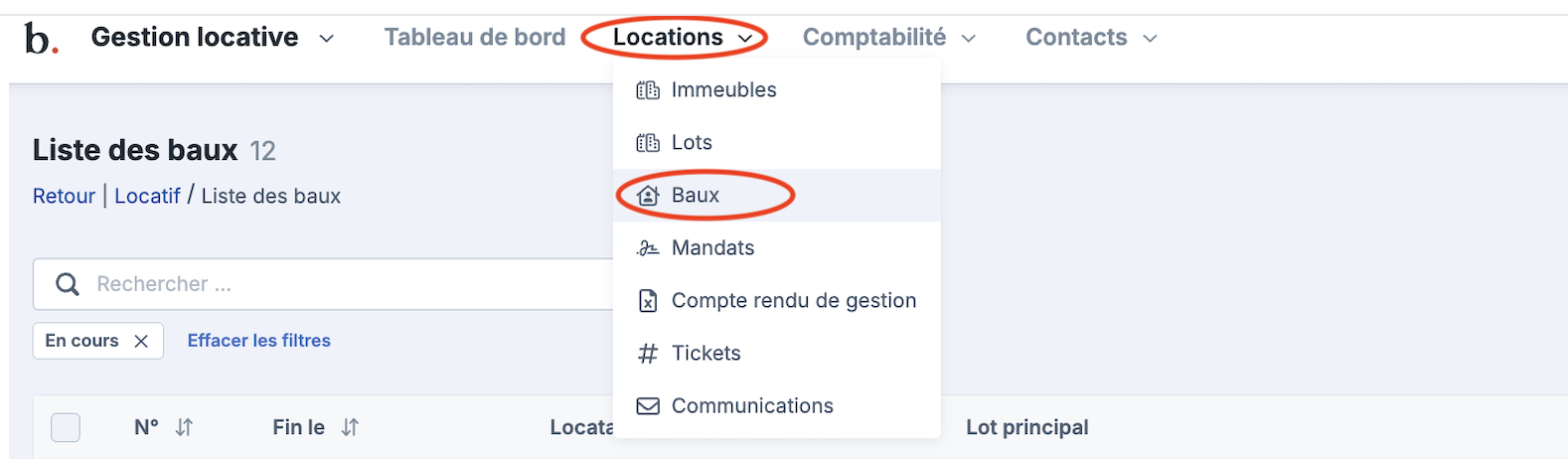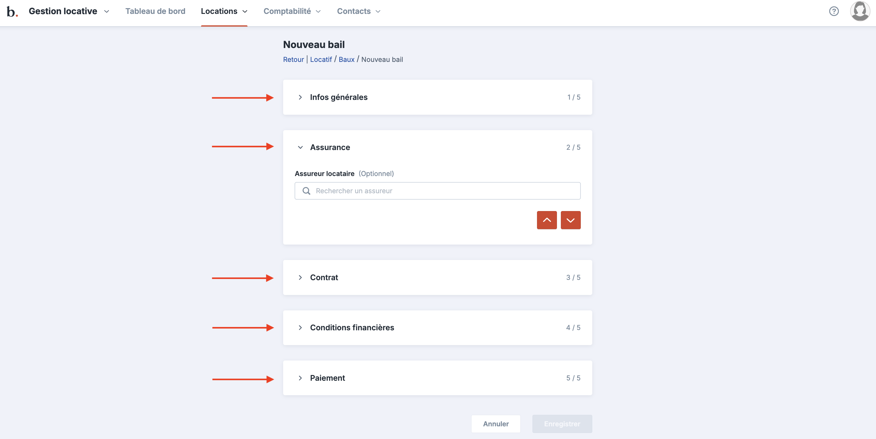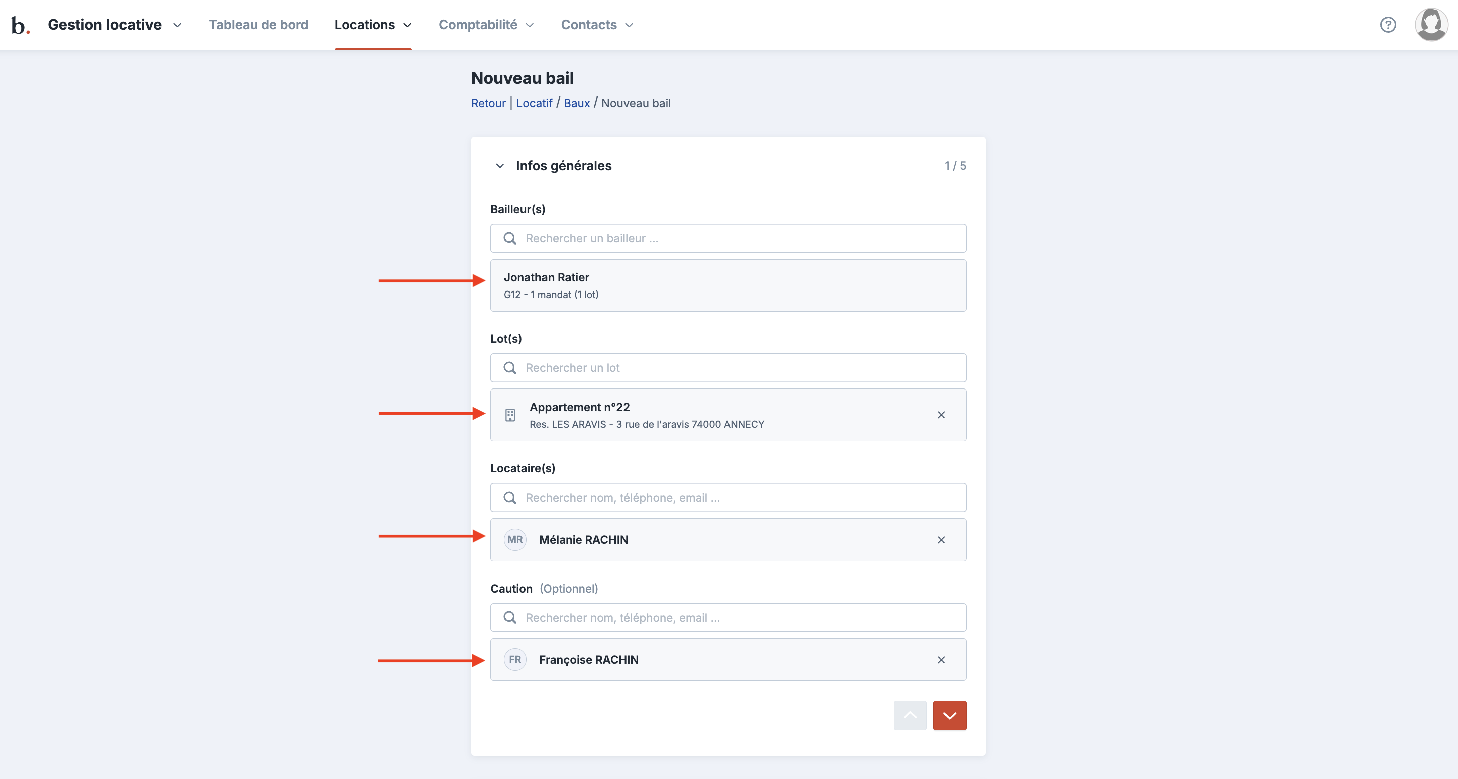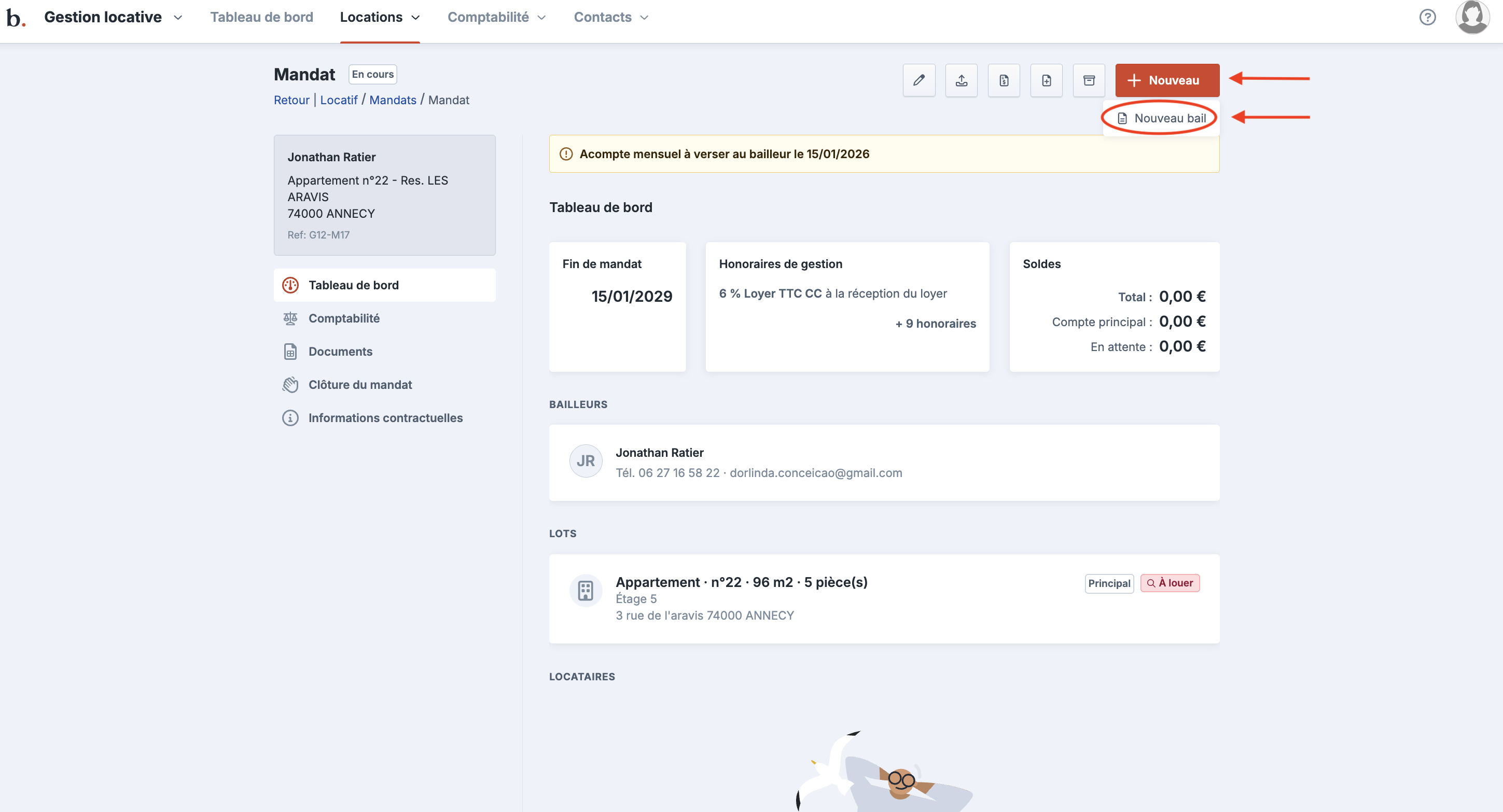 💡 Cette étape consiste à renseigner les informations relatives au bail. Nous vous conseillons de créer, en amont, votre immeuble/lot/contact/prestataires rattachés à votre "mandat" et votre "bail" s'ils ne sont pas déjà dans votre base de données.