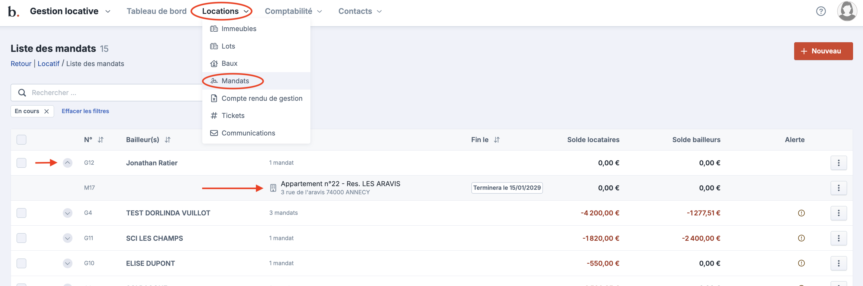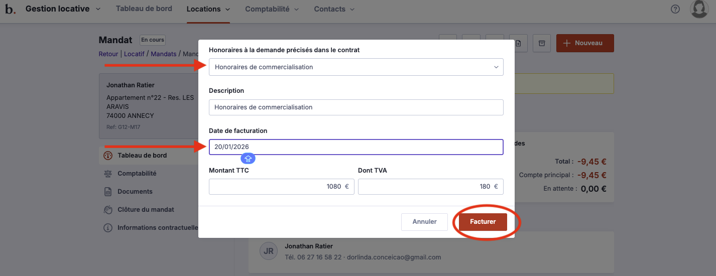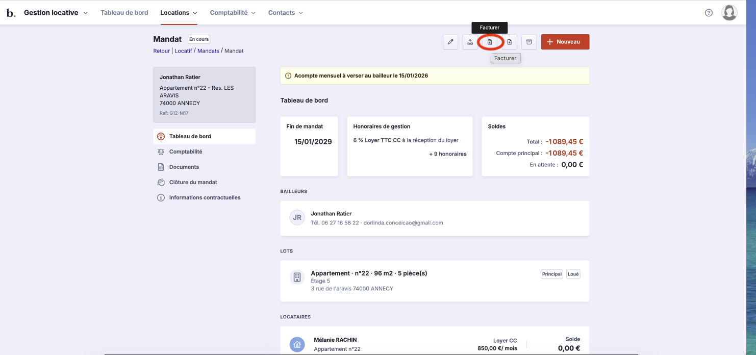 Vous devez ensuite facturer le "honoraires de commercialisation au bailleur". Cliquez sur le "Nom du bailleur" pour accèder au TDB du mandat.