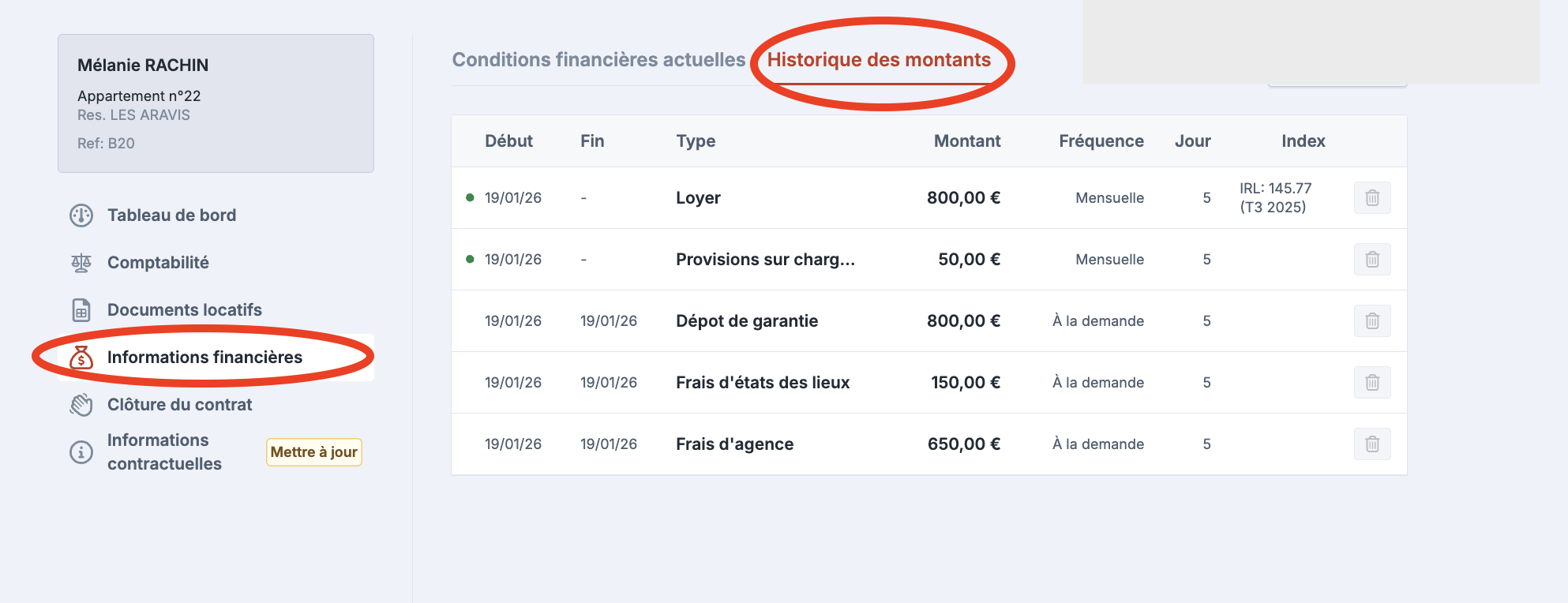 💡 Pour contrôler vos données renseignées consulter "Informations financières / Historique des montants" et "Informations contractuelles".