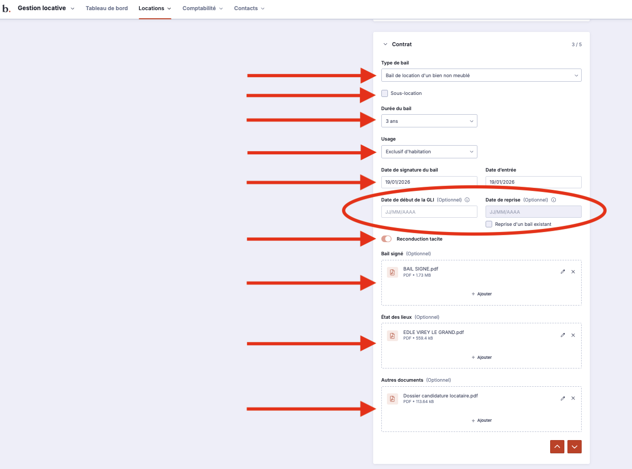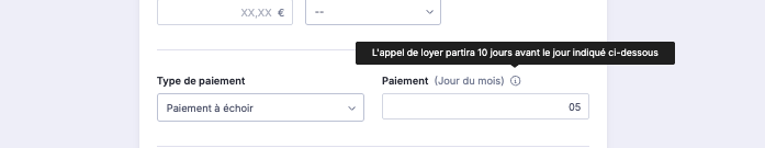 💡 La partie "Paiement" permet de renseigner la date d'exigibilité inscrite dans le contrat de bail.