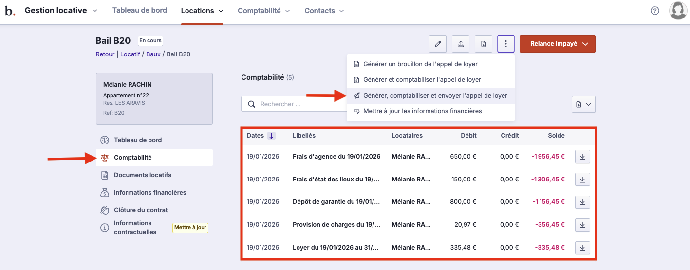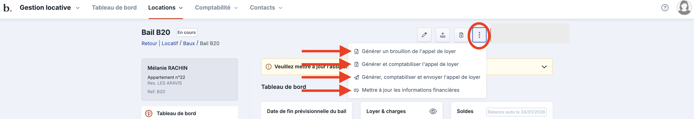 💡Générer un brouillon d'appel de loyer / Générer et comptabiliser l'appel de loyer / Générer, comptabiliser et envoyer l'appel de loyer / Mettre à jour les informations financières.
