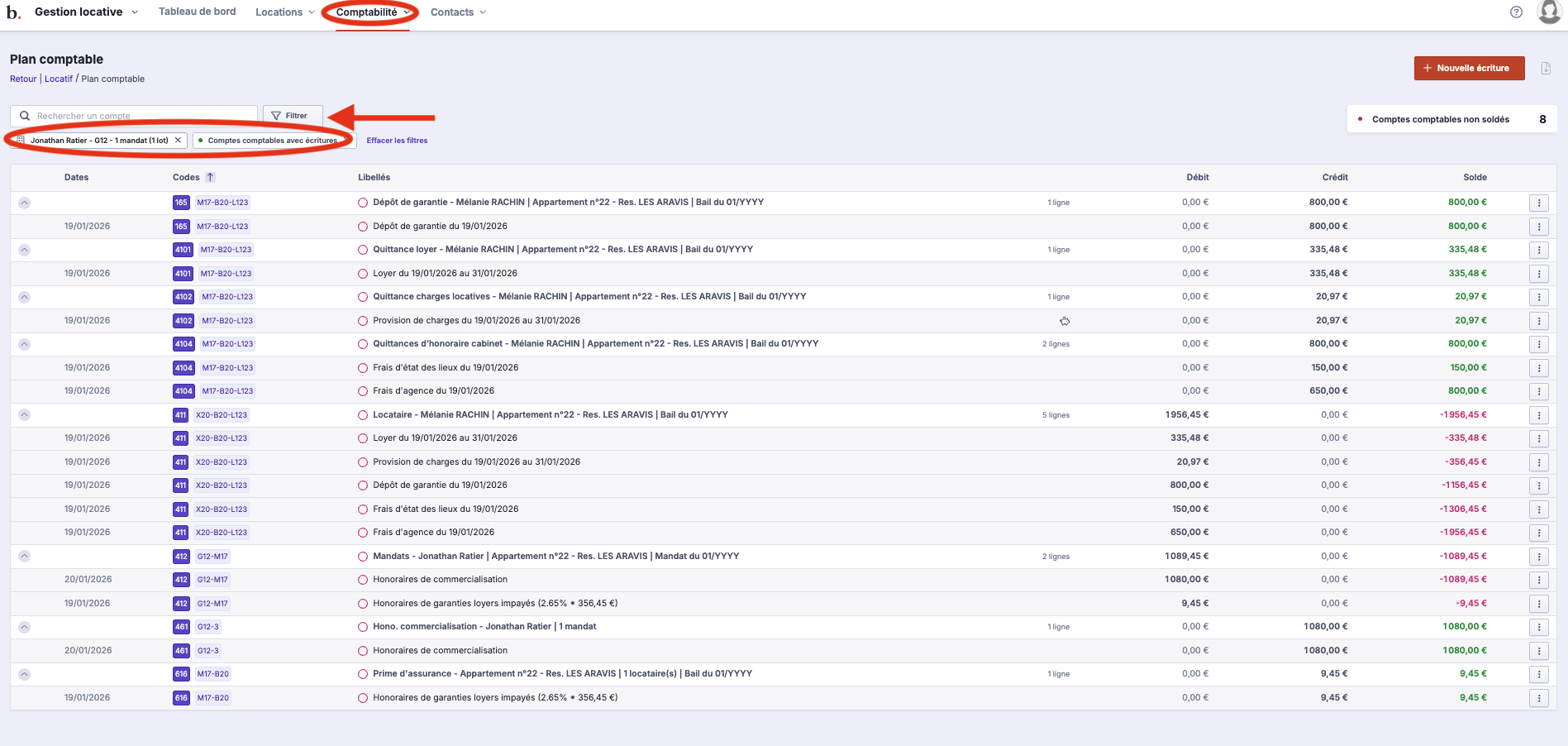 Visualisez le quittancement et la facturation de l'ensemble de mon mandat (locataire/bailleur) en cliquant sur "Comptabilité" / "Plan comptable" / "Sélectionner votre bailleur".