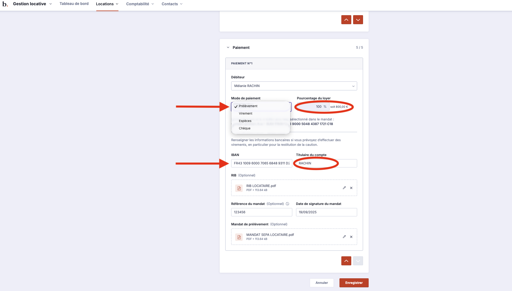 💡 Pour mettre en place un "Prélèvement", sélectionnez dans "Mode de paiement" l'option "Prélèvement" puis compléter l'ensemble de l'onglet comme indiqué ci-dessous. Le locataire doit avoir en amont signé un "Mandat de prélèvement".