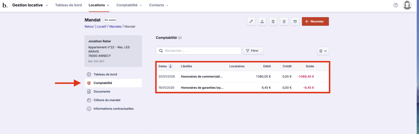 Visualisez la facturation des honoraires en comptabilité bailleur en cliquant sur "Comptabilité".