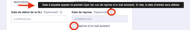 💡 La date de reprise est à renseigner uniquement en cas de "Migration" ou "Nouveau mandat avec locataire en place". Cochez la case "Reprise d'un bail" et renseigner la "Date de reprise".