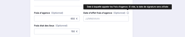 💡 La partie "Date d'effet frais d'agence" est à renseigner uniquement si la date d'exigibilité est différente de la date de signature du bail. Si la date d'exigibilité est identique "à la date de signature de bail" ne pas renseigner cette date.