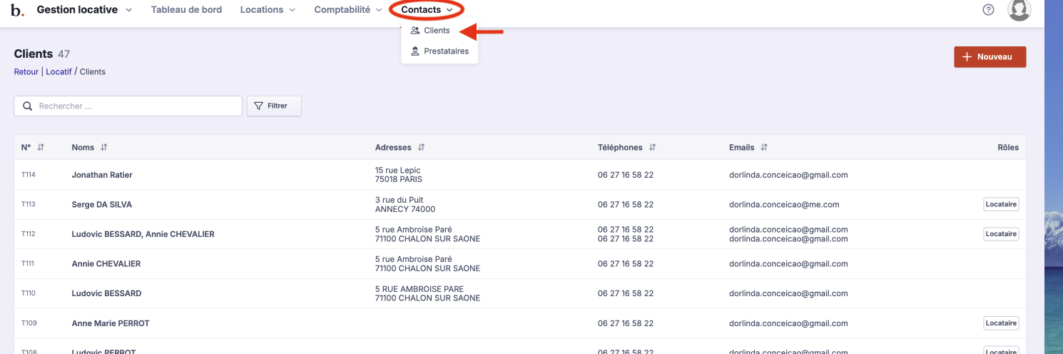 Sélectionnez le locataire pour rentrer dans dans "fiche locataire"